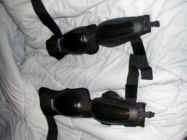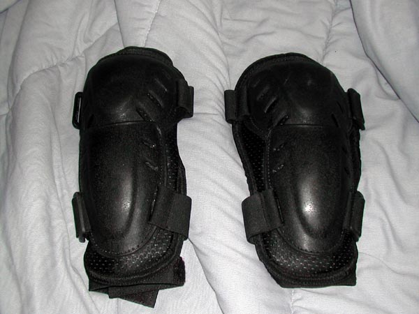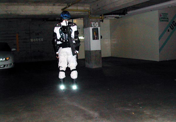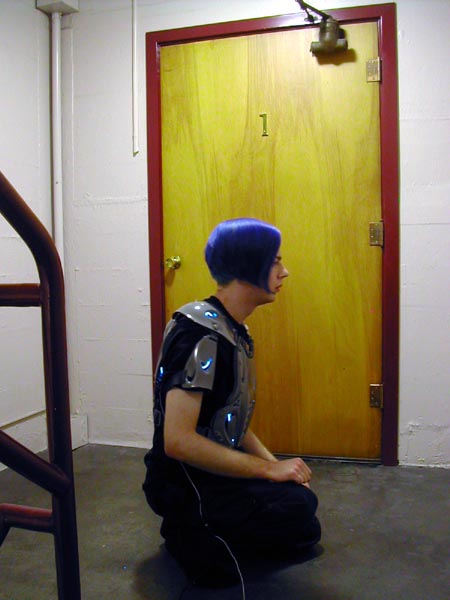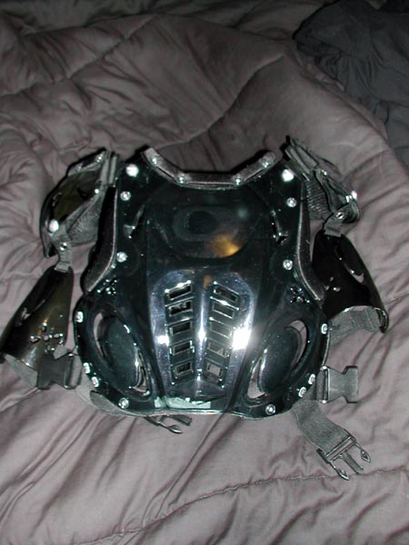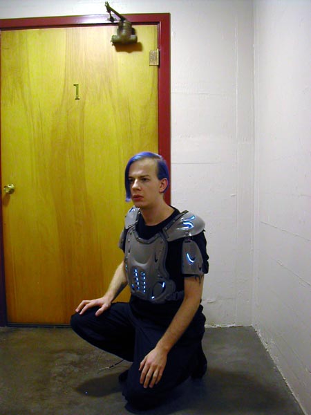 The body armour is motocross gear that I bought on eBay. The chest protector is by Vega, the arm guards are by SixSixOne, and the knee guards are actually elbow guards that turned out to be *way* too big for me. The chest protector is wired up with 9 feet of EL wire, powered by 4 AAA batteries hooked to a DC->AC transformer. The wire is connected through a parallel distribution bus I made from an 8-point barrier strip.