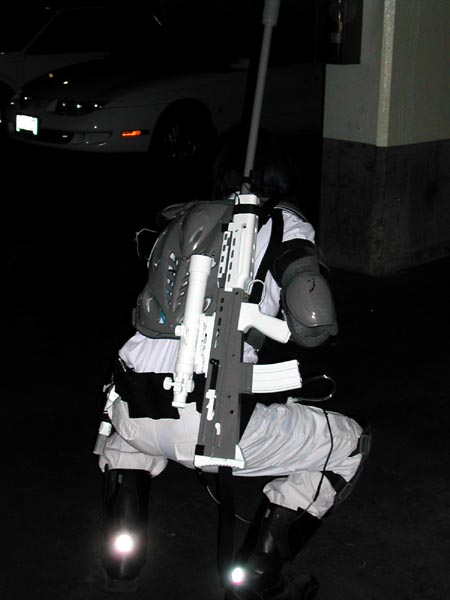 The rifle and armour both took a relatively long time to make, so I took some pictures of them midway through the process. The armour shots really show off the EL wire glow. It's even more impressive in a dark club-type environment. The internal shots show the power bus for those who are curious about that. The framing is poor on these because I shot them myself using the timer on my camera.