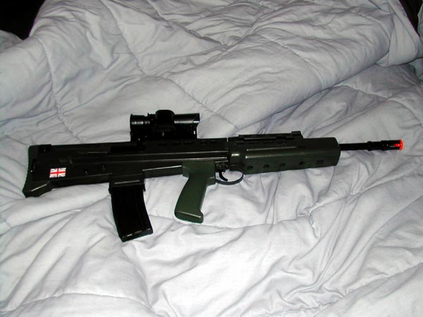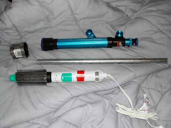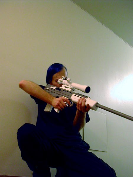 The rifle started out as an airsoft replica of a British L85A1 assault rifle. I'm fond of this particular model because it looks like it's from a sci-fi film as-is, and because it's a bullpup design (the ammunition magazine is located at the back of the rifle instead of the front, increasing the effective barrel length). I increased the barrel length by about a foot and a half using 1/2" galvanized pipe from Home Depot. The increased width also looks more appropriate for the .50 caliber ammunition the "cannister rifle" (or a lot of sniper rifles in general) is supposed to fire. The "flash hider" is the business end of some kind of hairstyling appliance I bought at Goodwill, minus the plastic spines. The scope is a small toy telescope that I found at a clearance store, and it's held to the original scope mount by metal bands which were taken from a pipe joint thing (also from Home Depot). The laser sight is from an airsoft pistol. The shoulder strap was designed for an M-60 machinegun, which I figure is probably about the same weight as this finished prop.