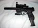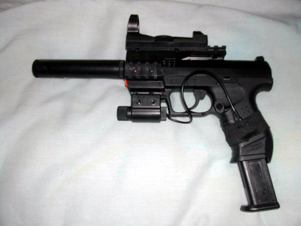 The handgun is an airsoft replica of the Walther P99 with a laser sight, scope, and mock silencer attached. It was unmodified except for the paint. The silencer originally had a sticker attached which read "Power Device - Self-Assembling." I'm not sure if the manufacturer intended to imply that it used nanotechnology or what, but the box it came in was similarly full of broken English descriptions of its capabilities. I had originally wanted to use a Walther Nighthawk (same concept, but much more ominous-looking), but the only replica available was as a CO2-powered pellet gun and would have cost more than most of the rest of the costume combined.