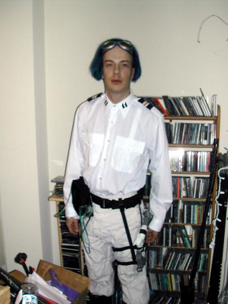 The uniform is a white pilot's top (commercial airline, I think) with captain's bars that I bought at a local supply shop (Kroesen's, if you're in Seattle). The pants are by Fox, and also intended for Motocross riders.